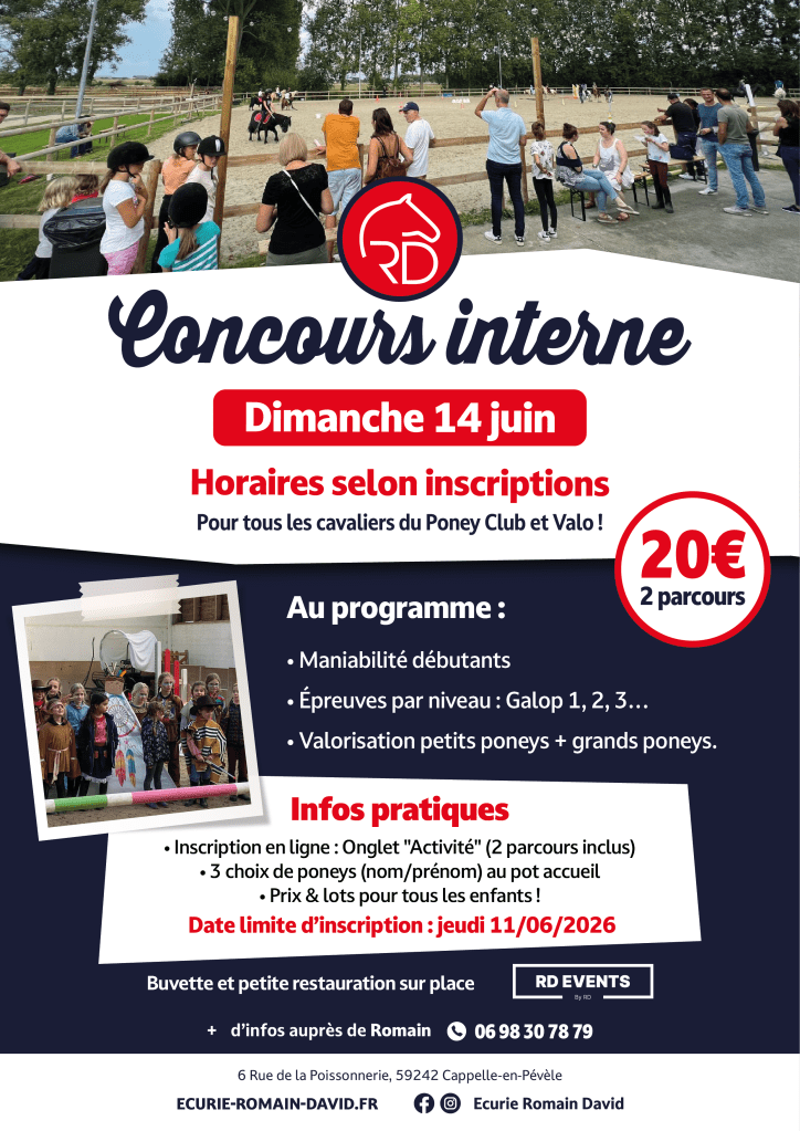 Le dimanche 14 juin 2026, l’Écurie Romain David organise un concours interne à Cappelle-en-Pévèle, réservé aux cavaliers du Poney Club et Valo.
