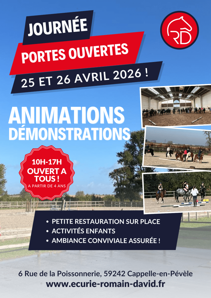 Les 25 et 26 avril 2026, l’Écurie Romain David vous accueille à Cappelle-en-Pévèle pour deux journées portes ouvertes placées sous le signe de la convivialité, de la découverte et du partage autour du cheval.